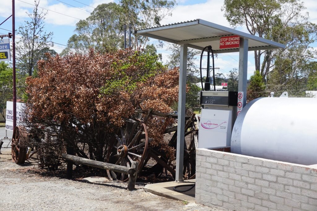 Bellbrook had a fire right into town burning a few houses to the ground and making a mockery of the no-smoking sign on the fuel bowsers. A quick top-up and a snack and I headed west following the mighty Macleay River which was at a historic low at the moment.