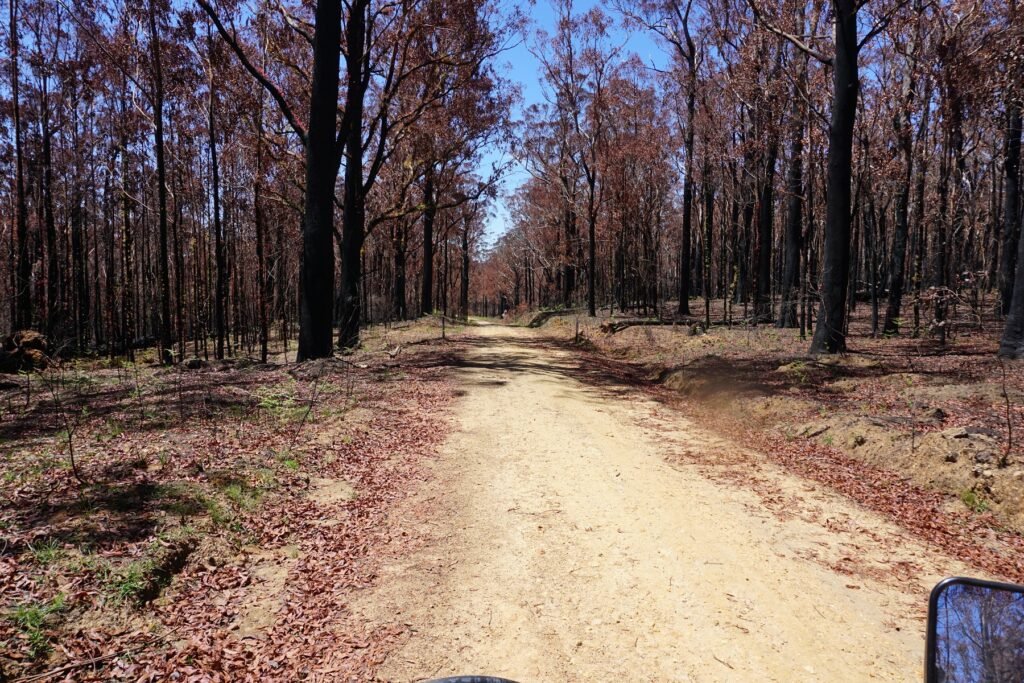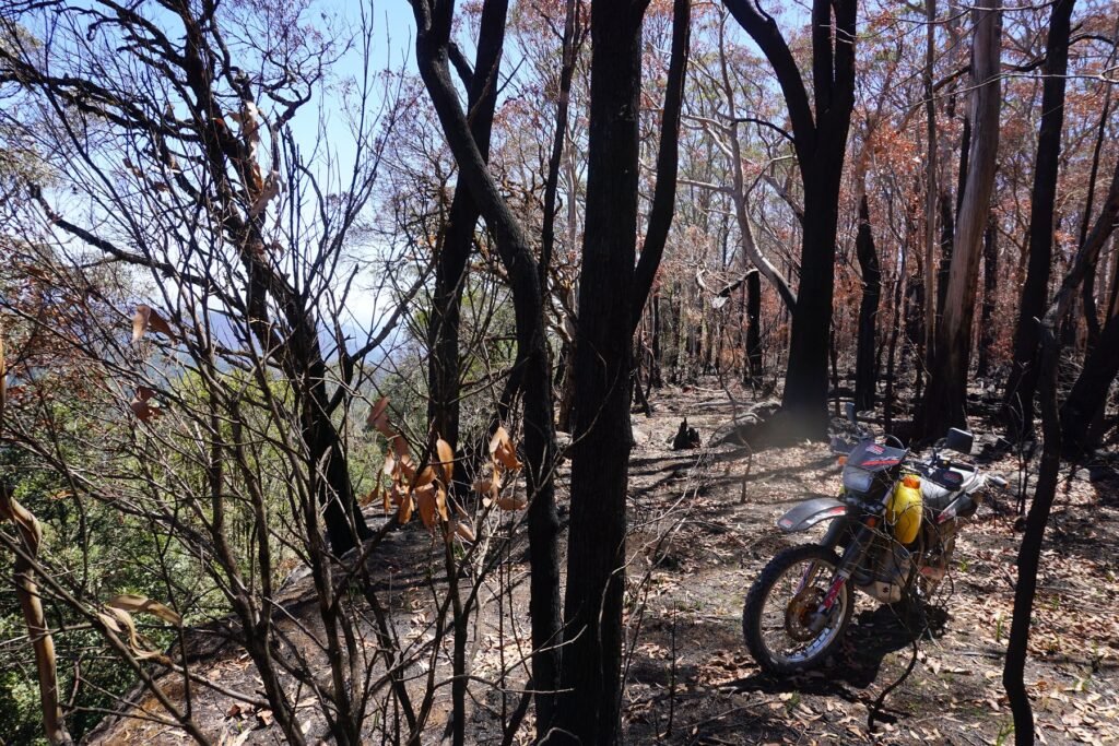 Backroads and forests are still available so after a few days of rain, the sky returned to a sparkling blue instead of a Smokey hue. I headed for Bellingen, topped up the fuel and followed the Dualsport Australia route to Bellbrook through the devastation of leafless burnt and charred trees.