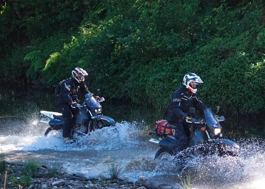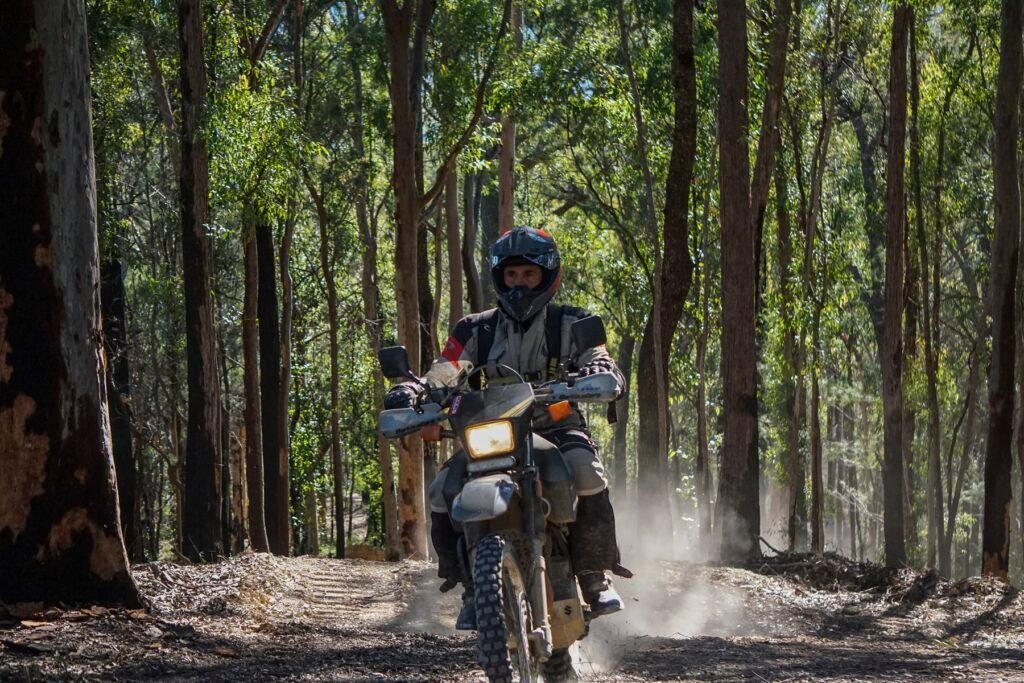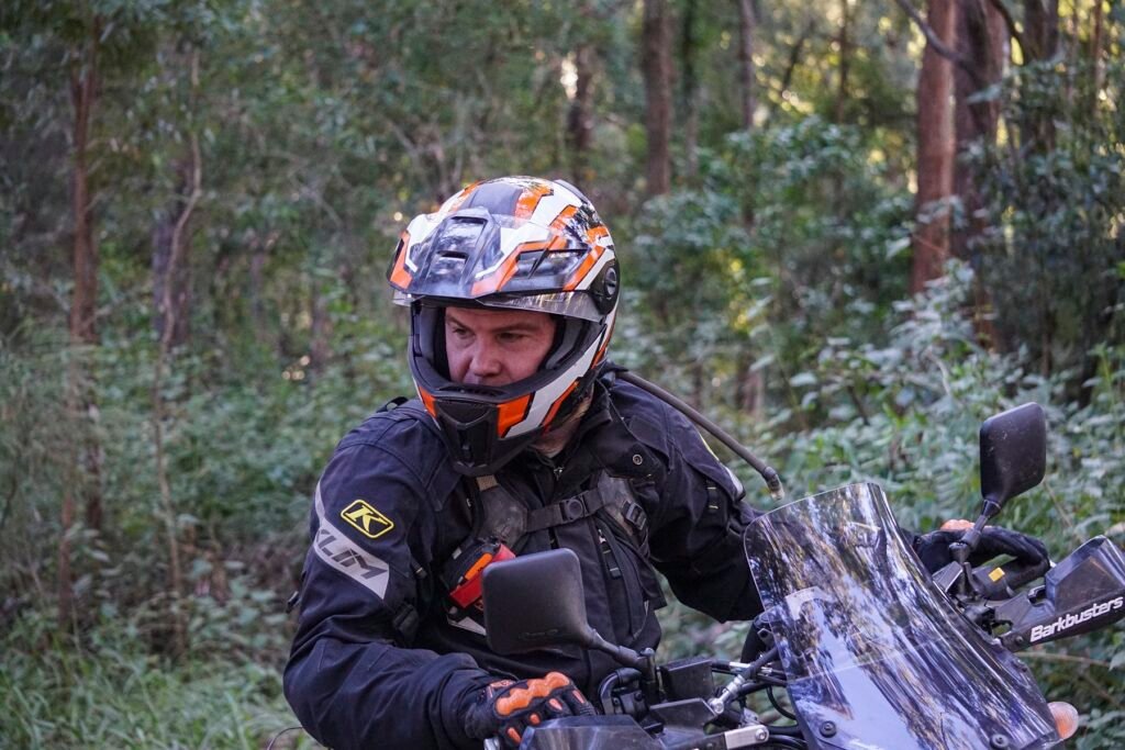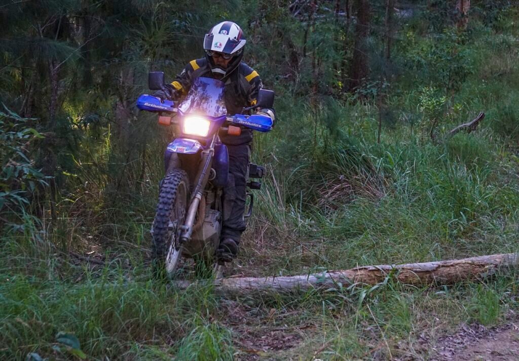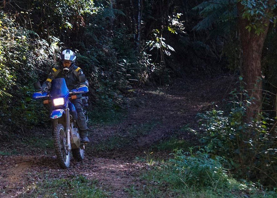 At this stage I was sure I was gone, the only reason I didn’t give up was that I was carrying too much speed and I know from experience the ground is hard through here. As I was hanging off like a flag we drifted into the ferns, this triggered some violent headshakes but at least sort of heading in the right direction. My feet came back to the pegs and 30m later I was stopped and still somehow upright.
