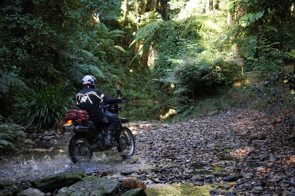 A short run on slippery tight corners to the end of the road followed by a half a dozen more river crossings through a remote farm. The crystal clear crossings and a blissful leaf mulch covered climb onto the horseshoe are really something special.