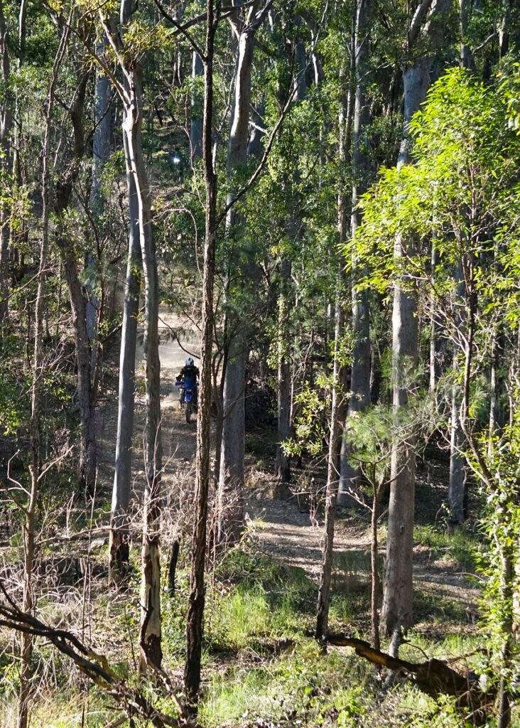 We headed for the freshly bulldozed ridges to the east. The first climb had a tricky steep pinch on a corner which caused a bottleneck. Eventually, the crew made the top to be rewarded with a steep long loose downhill, followed by an undulating narrow ridge that’s brilliant.